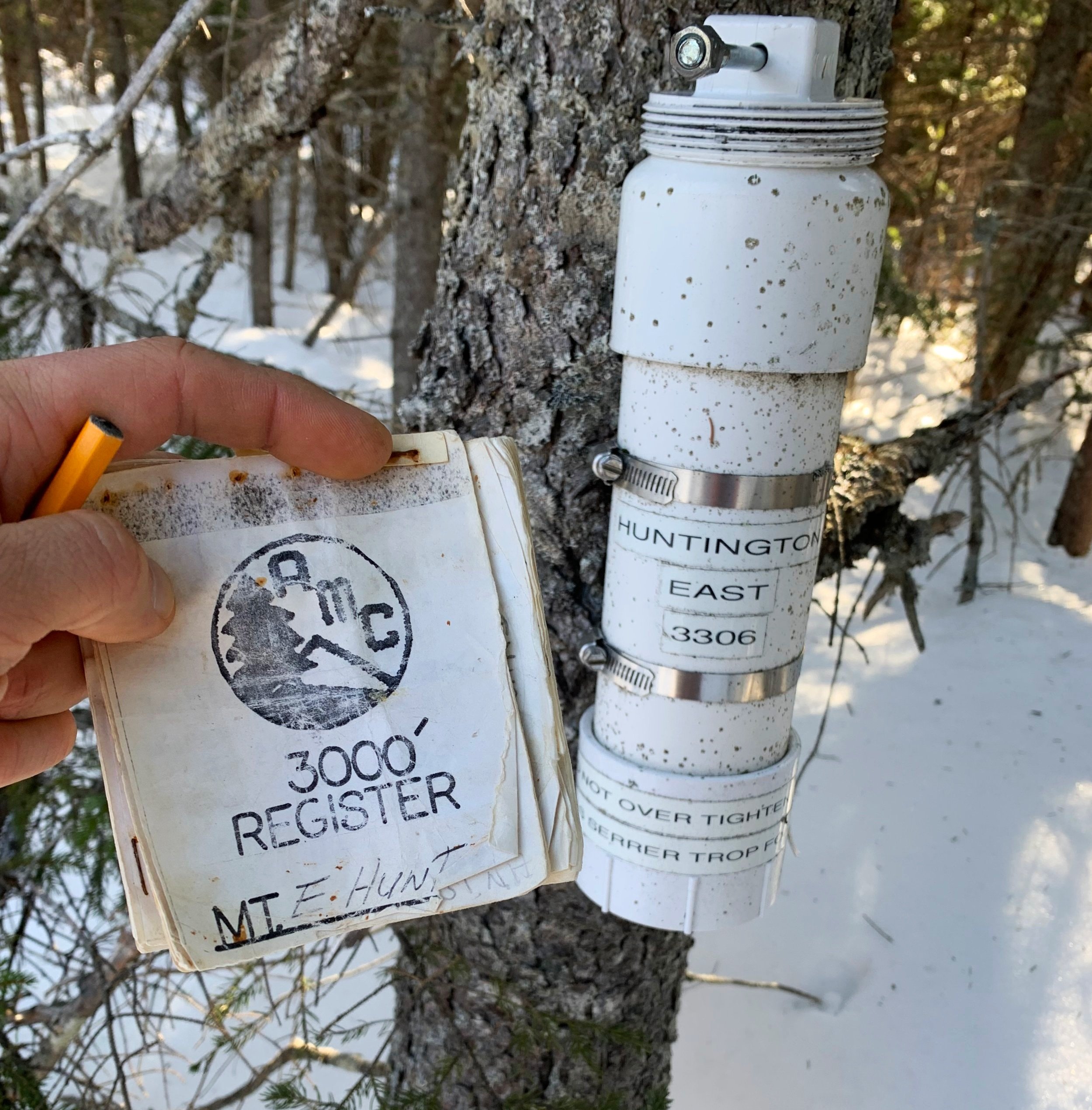 With a few good sips of dandelion tea, I signed into the summit log book, recording my ascent into the history (note)books - while even taking a few moments to glance at entries in an older AMC 3000-footers register log placed in the early-’90s.