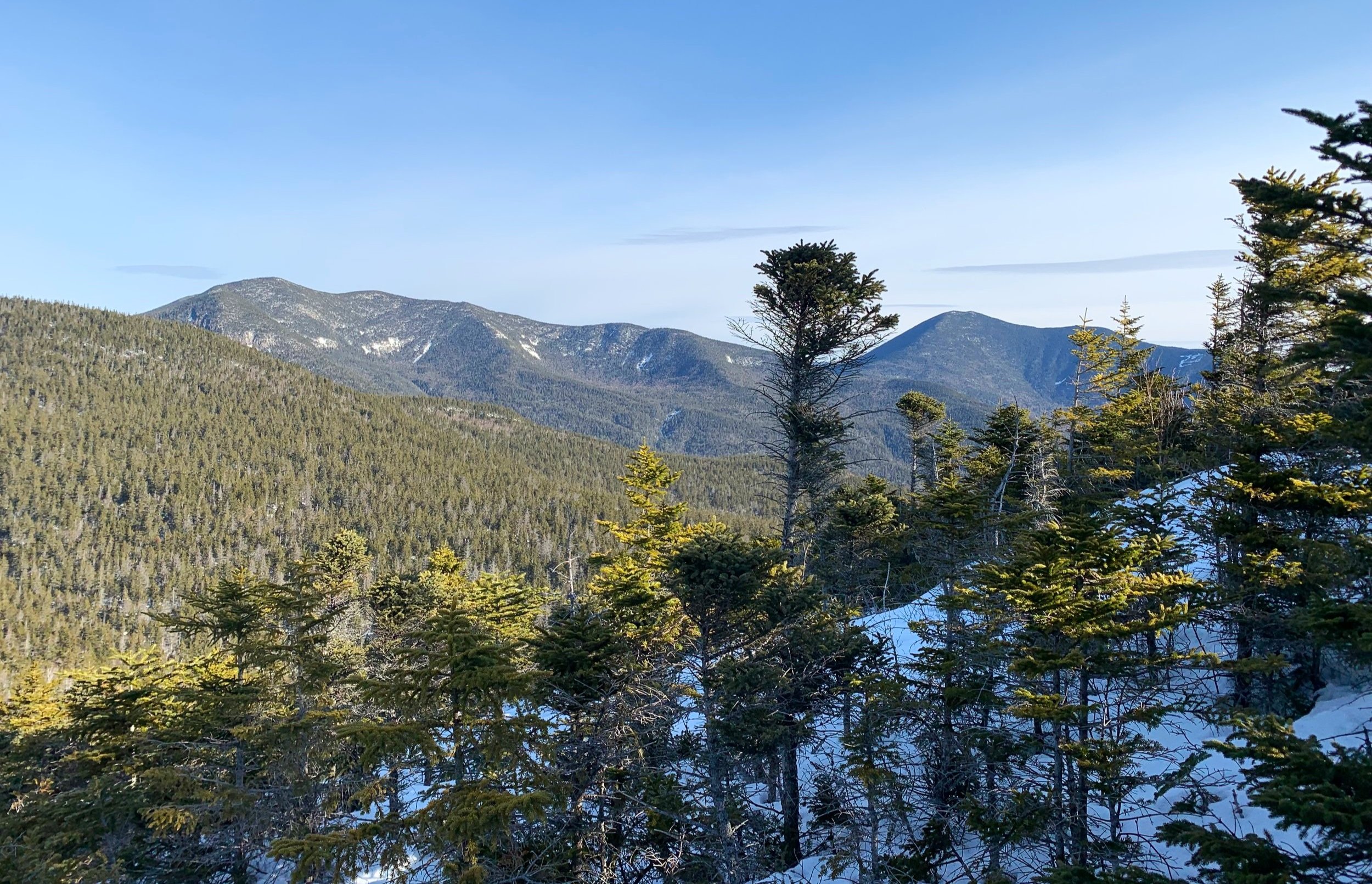 Continuing further east momentarily I was able to find a stunning lookout with a similar South Huntington view as earlier, but now with a wider panorama including the southern side of South Hancock (4,319’) and Mt Carrigain (4,680’) with Signal Ridge. A mountaintop I could have stayed for a good long while had it not been for threats of melting snow giving way to spruce traps on my trek out.