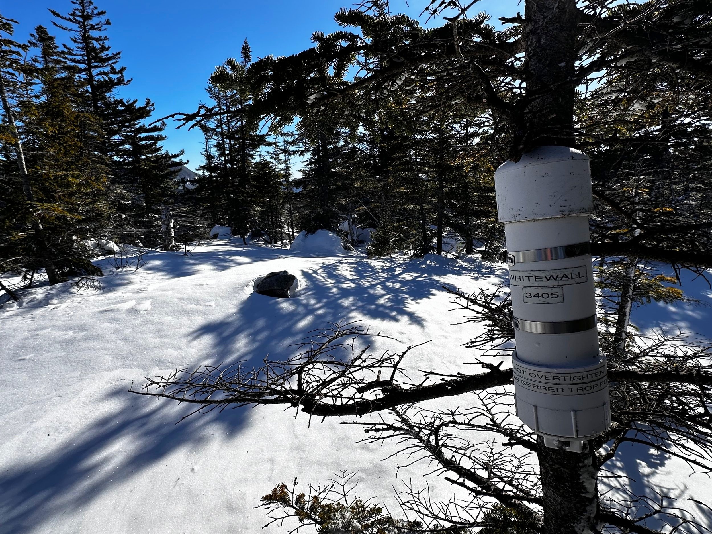 With snowshoes on mountaineering boots, I encountered a grotesque scene of countless postholes; initially, it was easy to assume a moose had unwittingly ventured steeply down this stretch of the A-Z trail, but it quickly became apparent that the frozen holes were placed by boots, with no equipment whatsoever to disperse the hiker’s weight. I found descending this length of Swiss cheese trail much easier by bushwhacking entirely off trail, through enjoyable, mature spruce and fir, while keeping the obliterated footpath in sight all the while.